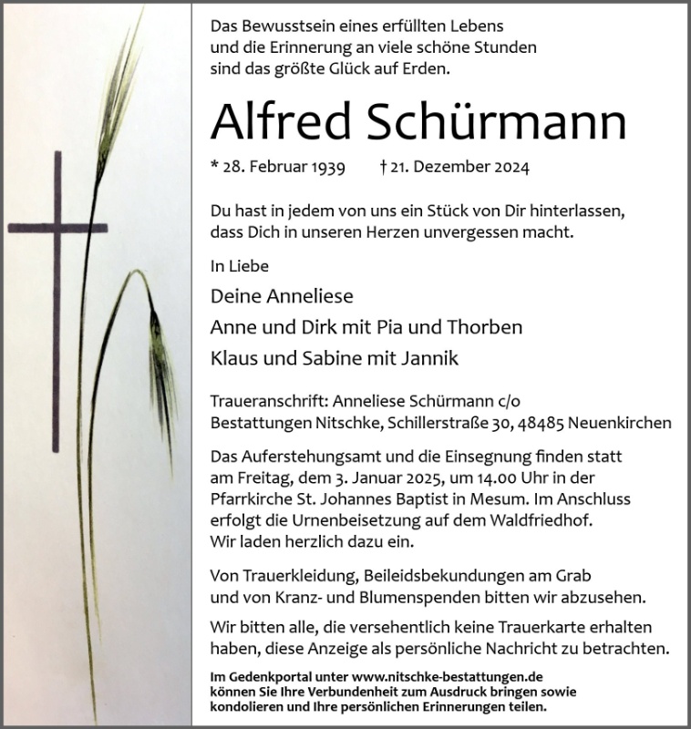Alfred, der über fünf Jahrzehnte unsere Nachbarschaft bereicherte, hat diese Gemeinschaft ohne sich zu verabschieden, unerwartet verlassen. Eine Art, die ihm normal nicht zu eigen war. Wir haben ihn immer als geerdete, gradlinige Persönlichkeit, jedoch nicht ohne Ecken und Kanten wahrgenommen. Jemand der tief verwurzelt war im münsterländischen bäuerlichem Milieu seiner Herkunft, was ihm besonders mit uns verband, war die plattdeutsche Sprache, handfestes Zupacken, wenn es sein musste und die schönen gemeinsamen Erinnerungen an Feste in der Nachbarschaft zu besonderen Anlässen.