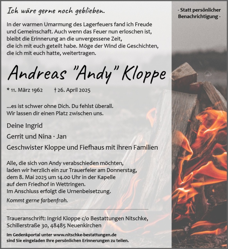 In tiefer Trauer müssen wir Abschied nehmen von Andreas Kloppe.