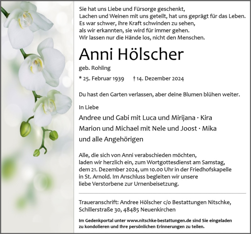 Leider haben wir erfahren müssen das Anni gestorben ist.Unser Beileid.