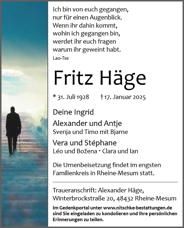 Mit stillem Gedenken nehmen wir Abschied von Herrn Häge, der nur kurze Zeit Teil unserer Gemeinschaft im Seniorenzentrum an den Wallgärten war. Wir werden seine freundliche Art in Erinnerung behalten. Unsere Gedanken sind bei seiner Familie.