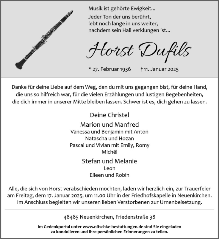 in den 90er Jahren hat mir Horst Dufils am AJG das Klarinette-Spielen beigebracht. Dafür danke ich ihm sehr.