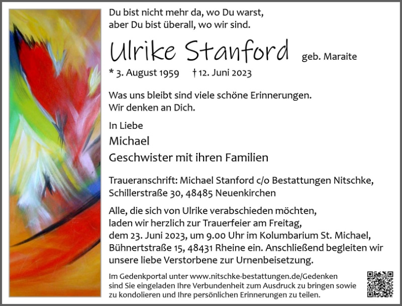 ich habe Ulrike als kleines Mädchen von 8 Jahren kennengelernt, als ich in den Ferien bei meiner Tante Frieda in Coesfeld war. In der ganzen Kinderschar war sie ein liebes freundliches Kind, das mir beim Kochen geholfen hat. Es ist so traurig, dass sie nicht nach einem langen Arbeitsleben die schönen Jahre mit Ihrem Mann genießen kann.