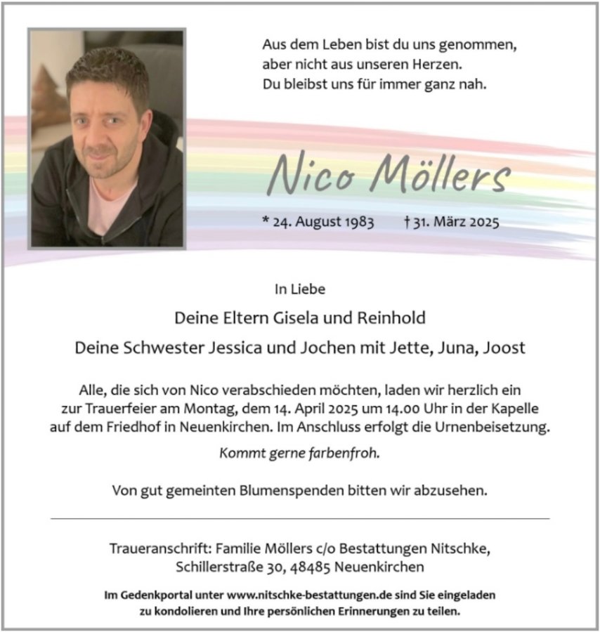 Ach Nico…nach der Schule haben wir uns aus den Augen verloren, aber aus dem Herzen verliert man jemanden wie Dich nie. Ich erinnere mich an viele lustige Anekdoten, jede Menge Freude beim Tanzen und unsere Zettelchen im Physikraum. Ich erinnere mich an Insider, gemeinsames Lachen und Deinen unvergleichlich verschmitzten Humor. Und ich weiß, hätten wir uns mal wieder getroffen, egal wann, wäre es gewesen, als wären nur ein paar Tage vergangen.